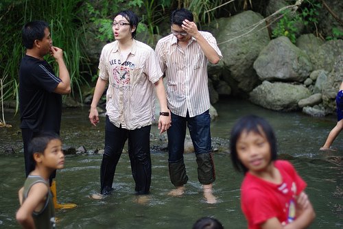 阿寬和史萊姆正在水邊跟總幹事懇談。總幹事還穿雨鞋,真是準備周到阿!